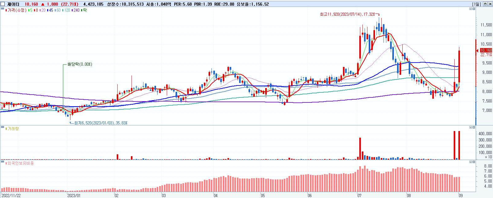 - 제이티 (10,160원 ▲ 22.71% , 시총: 1,048억, 거래량: 4,439,632, 거래대금:417억)