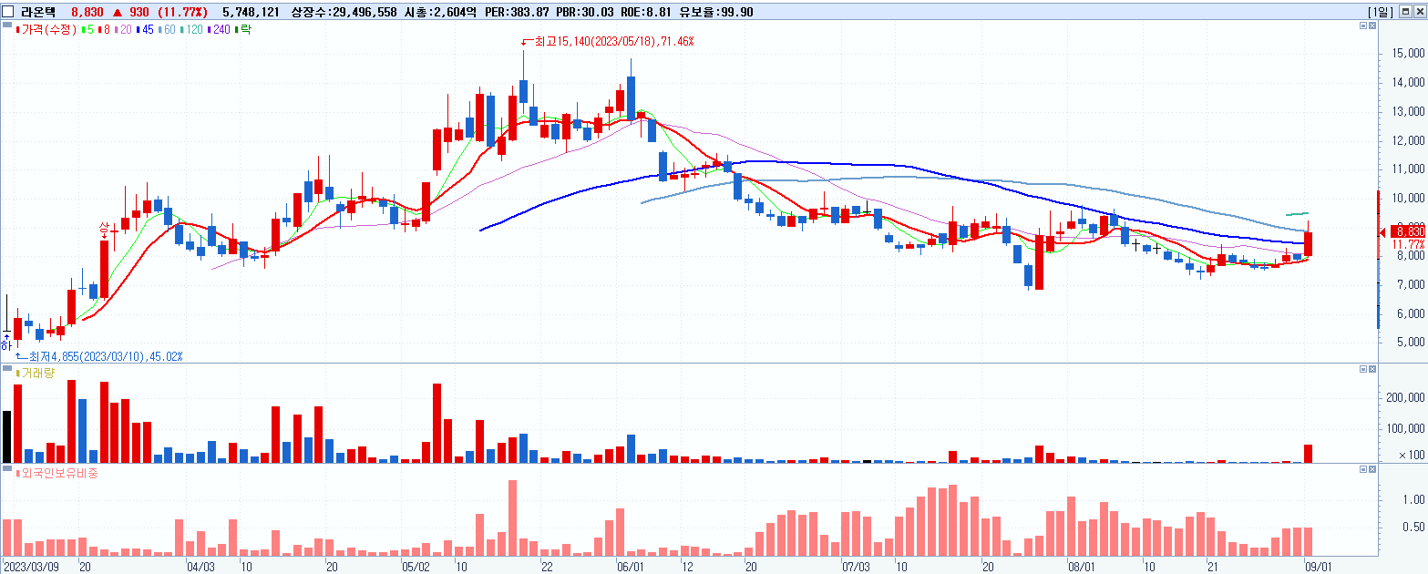 - 라온텍 (8,830원 ▲ 11.77% , 시총: 2,605억, 거래량: 5,749,244, 거래대금:509억)
