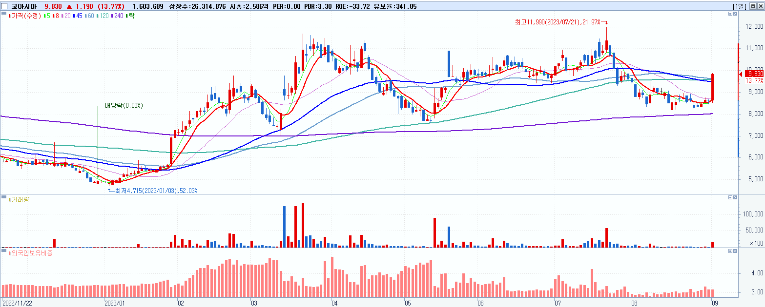 - 코아시아 (9,830원 ▲ 13.77% , 시총: 2,587억, 거래량: 1,605,085, 거래대금:150억)