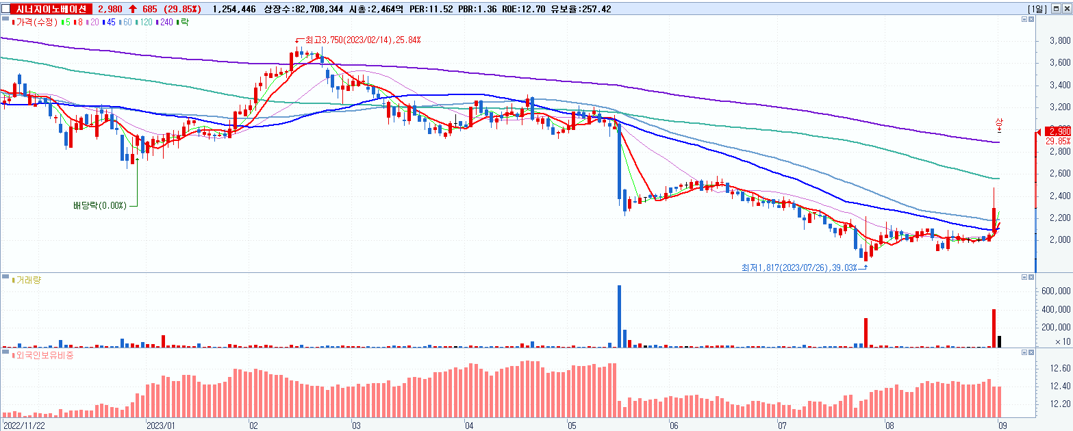 - 시너지이노베이션 (2,980원 ▲ 29.85% , 시총: 2,465억, 거래량: 1,254,446, 거래대금:37억)