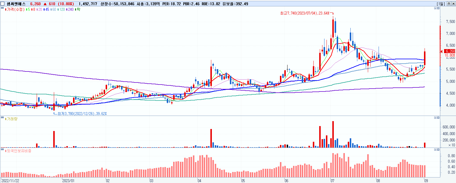 - 샘씨엔에스 (6,260원 ▲ 10.8% , 시총: 3,140억, 거래량: 1,492,778, 거래대금:92억)