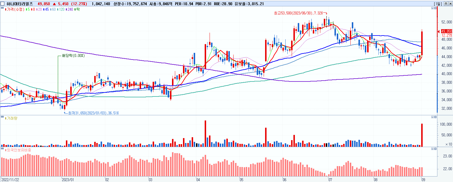 - 하나머티리얼즈 (49,850원 ▲ 12.27% , 시총: 9,847억, 거래량: 1,042,500, 거래대금:509억)