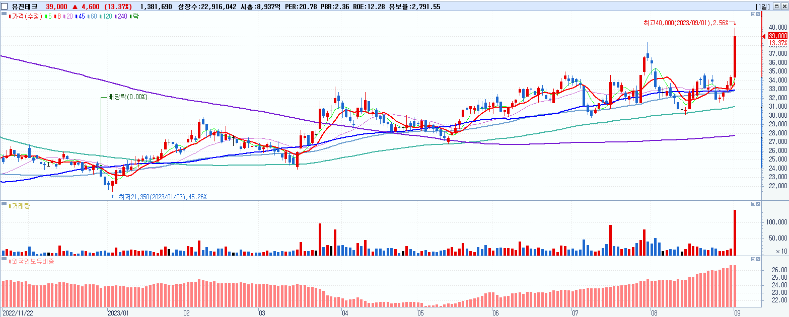 - 유진테크 (39,000원 ▲ 13.37% , 시총: 8,937억, 거래량: 1,384,996, 거래대금:524억)