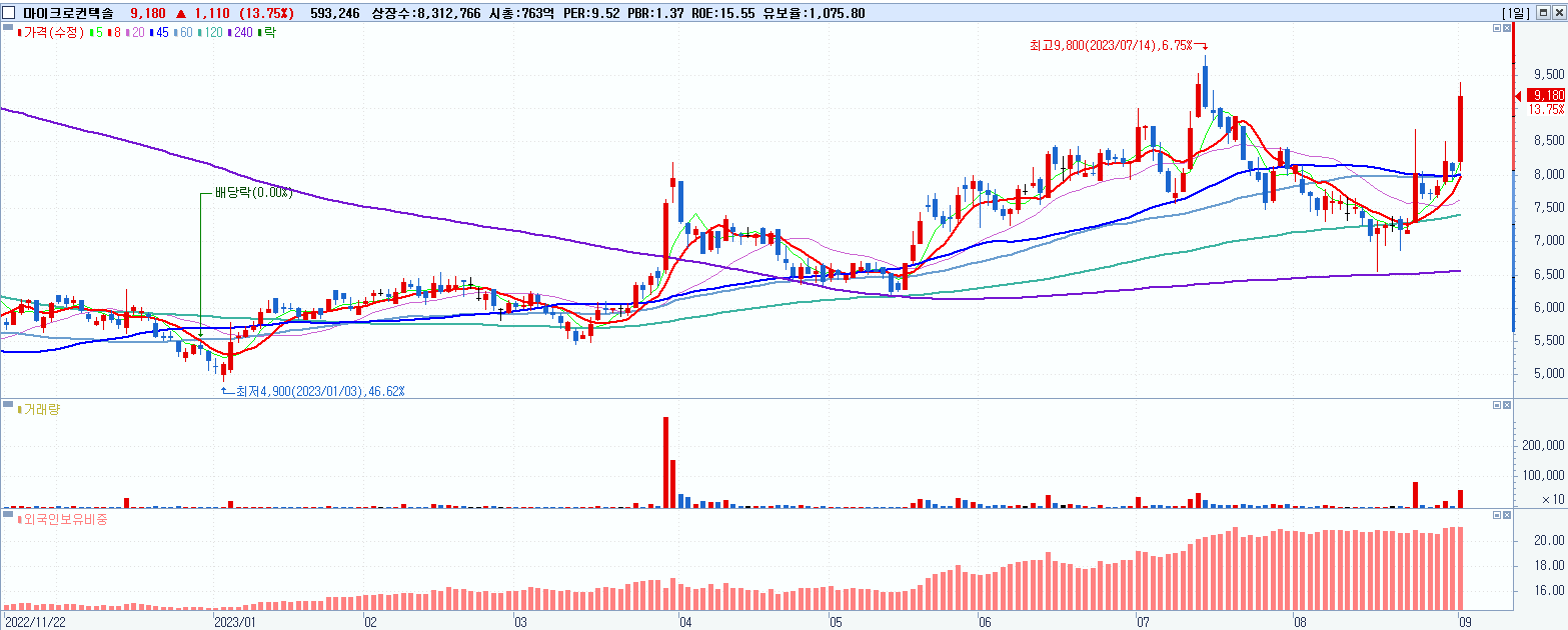 - 마이크로컨텍솔 (9,180원 ▲ 13.75% , 시총: 763억, 거래량: 593,265, 거래대금:53억)