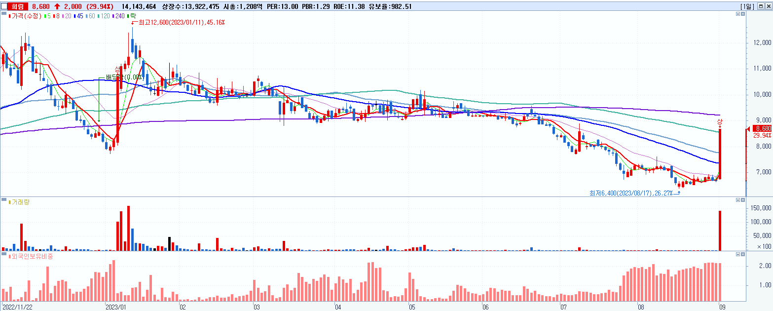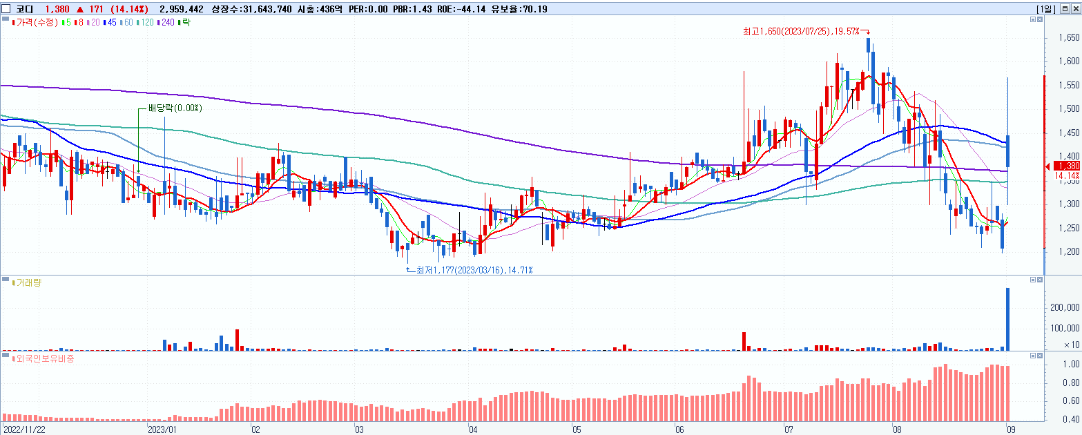 시총: 1,208억 거래량: 14,163,294 거래대금:1,179억