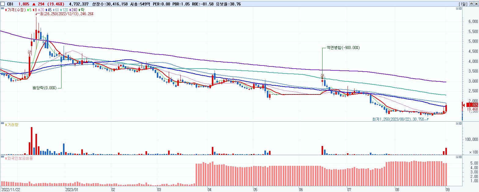 - CBI (1,805원 ▲ 19.46% , 시총: 549억, 거래량: 4,732,701, 거래대금:82억)