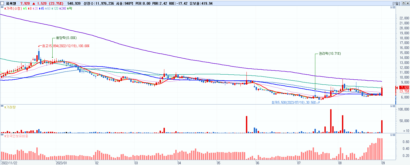 - 피씨엘 (7,920원 ▲ 23.75% , 시총: 949억, 거래량: 541,036, 거래대금:41억)