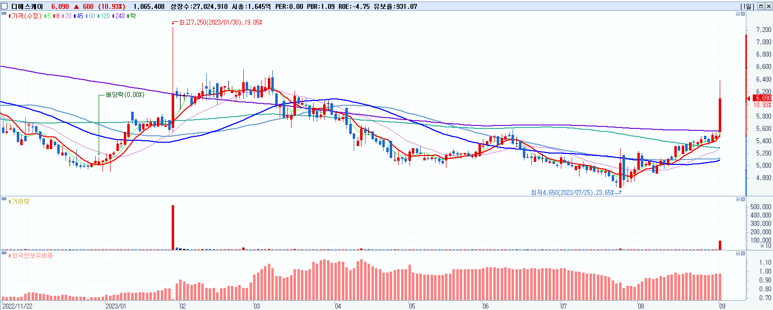 - 디에스케이 (6,090원 ▲ 10.93% , 시총: 1,646억, 거래량: 1,065,487, 거래대금:64억)