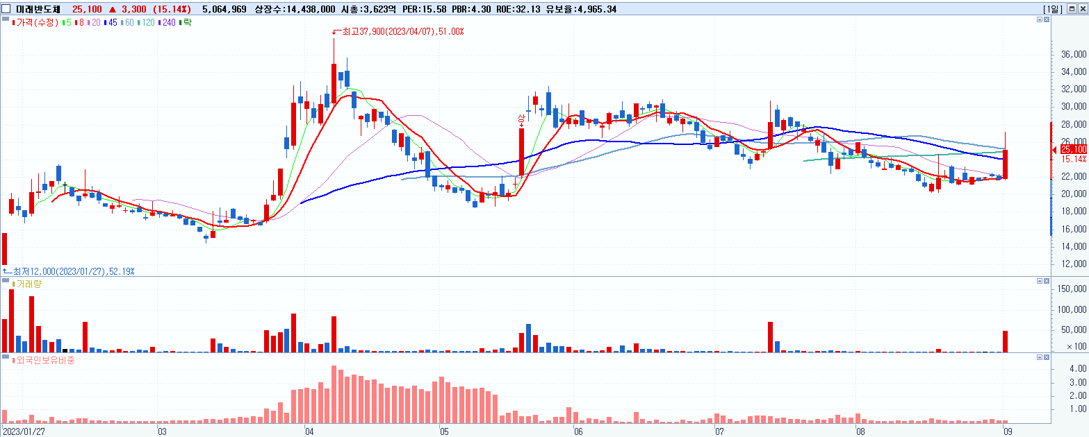 - 미래반도체 (25,100원 ▲ 15.14% , 시총: 3,624억, 거래량: 5,073,898, 거래대금:1,296억)
