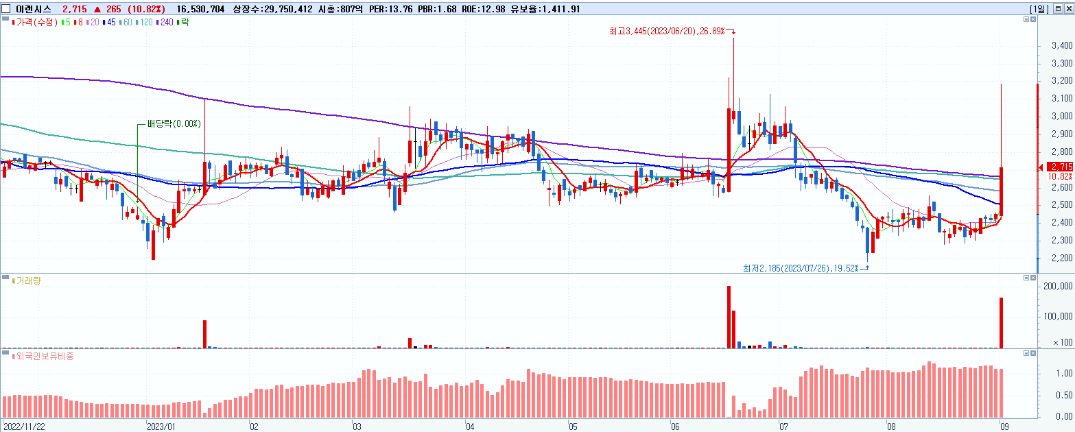 - 이랜시스 (2,715원 ▲ 10.82% , 시총: 808억, 거래량: 16,625,230, 거래대금:490억)