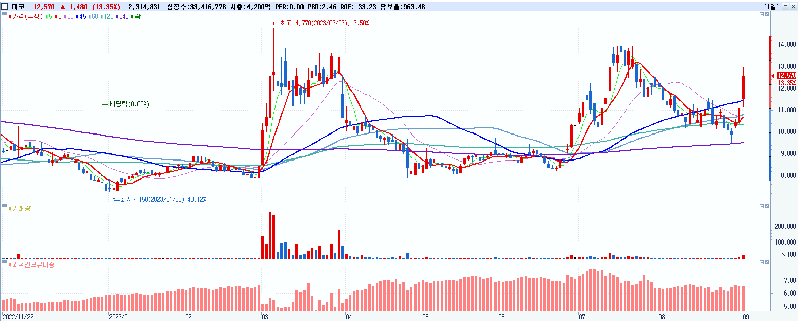 - 미코 (12,570원 ▲ 13.35% , 시총: 4,200억, 거래량: 2,314,985, 거래대금:281억)