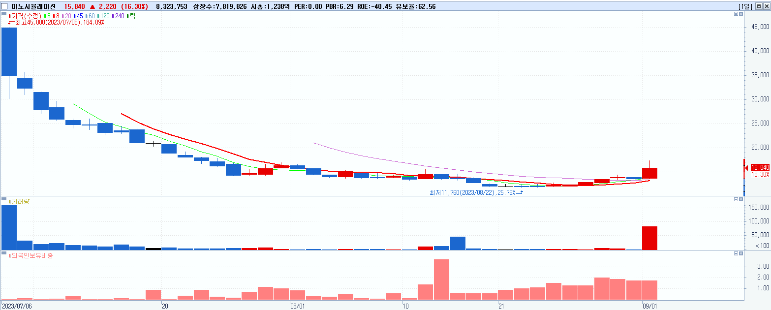 - 이노시뮬레이션 (15,840원 ▲ 16.3% , 시총: 1,239억, 거래량: 8,331,930, 거래대금:1,333억)