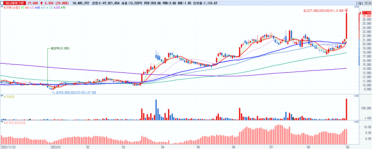 - 하나마이크론 (27,600원 ▲ 29.88% , 시총: 13,226억, 거래량: 18,406,952, 거래대금:4,734억)