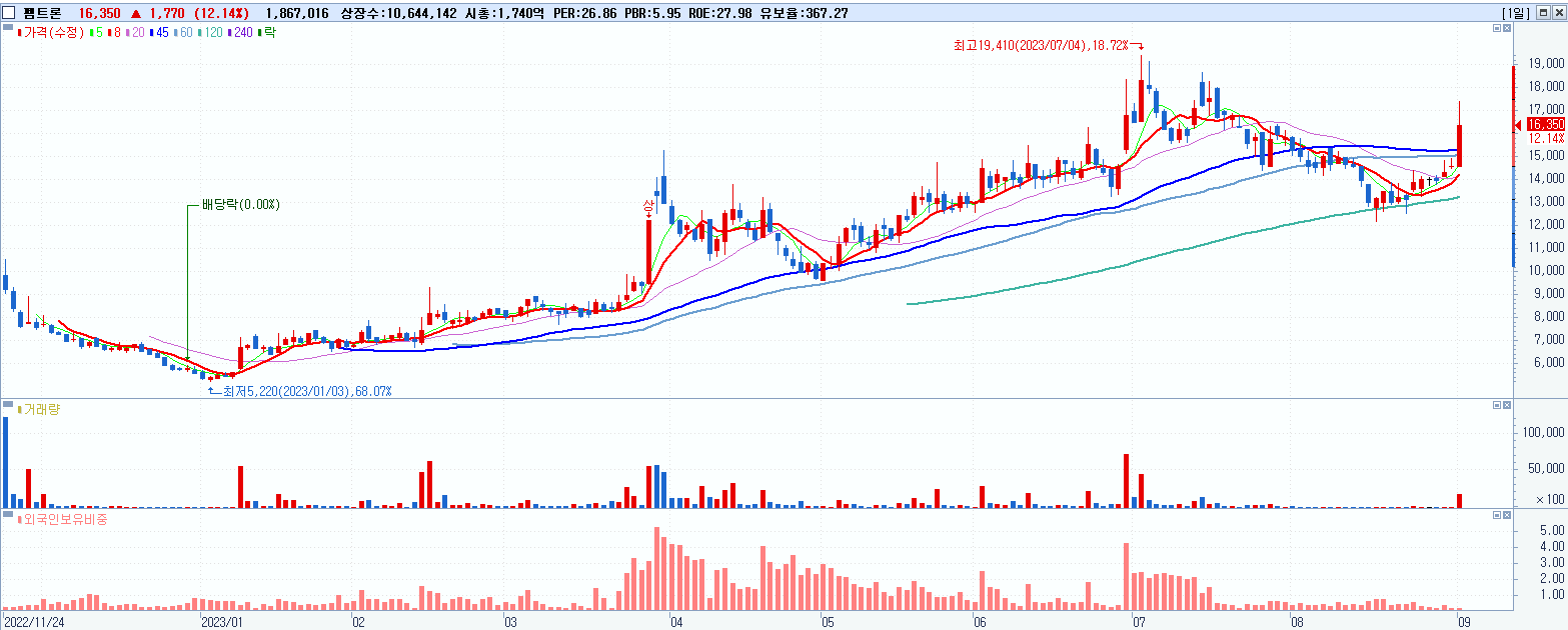 - 펨트론 (16,350원 ▲ 12.14% , 시총: 1,740억, 거래량: 1,867,925, 거래대금:311억)