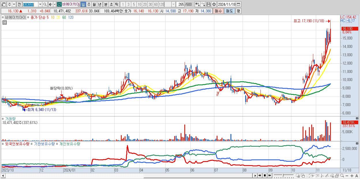 - 비에이치아이 (16,130원 ▲ 8.84% , 시총: 4,991억, 외국인 순매수 거래금:51억)