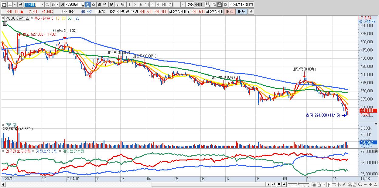 - POSCO홀딩스 (290,000원 ▲ 4.5% , 시총: 239,611억, 외국인 순매수 거래금:273억)