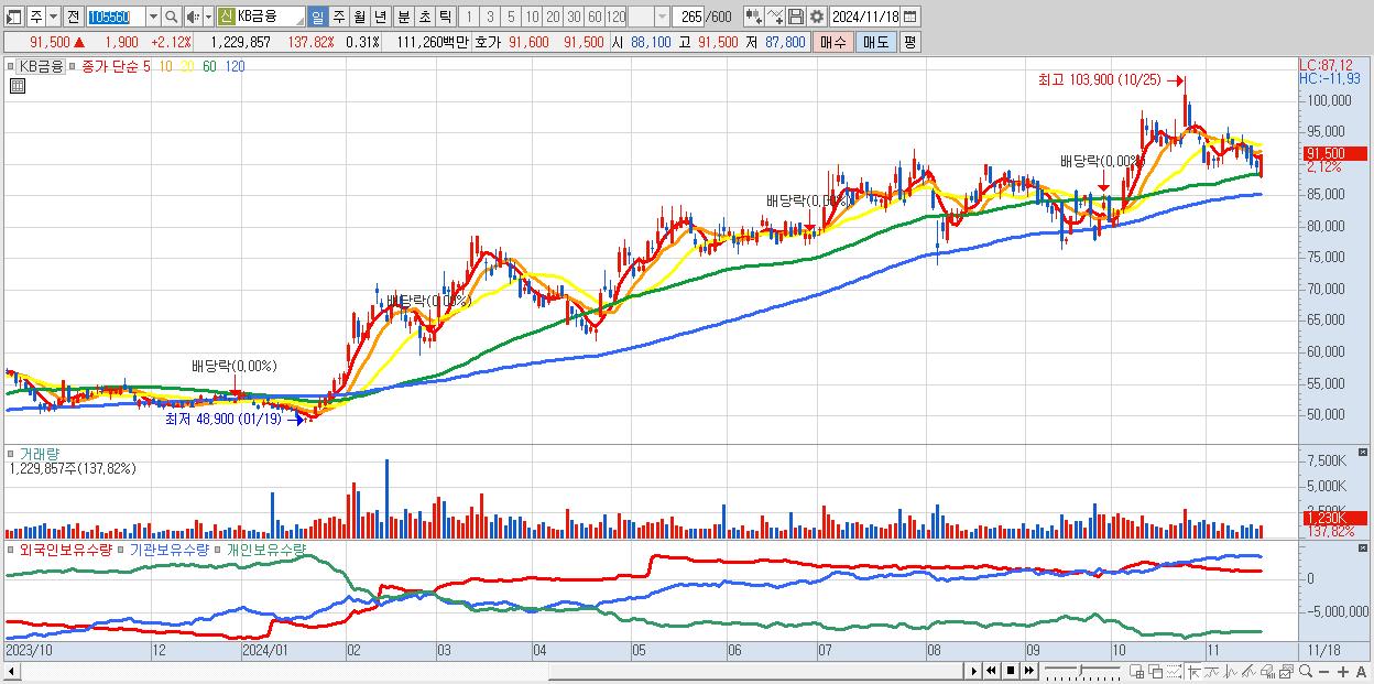 - KB금융 (91,500원 ▲ 2.12% , 시총: 360,079억, 외국인 순매수 거래금:91억)