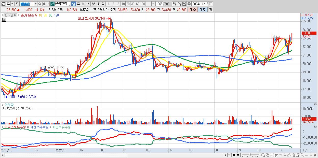 - 한국전력 (23,600원 ▲ 4.42% , 시총: 151,504억, 외국인 순매수 거래금:260억)