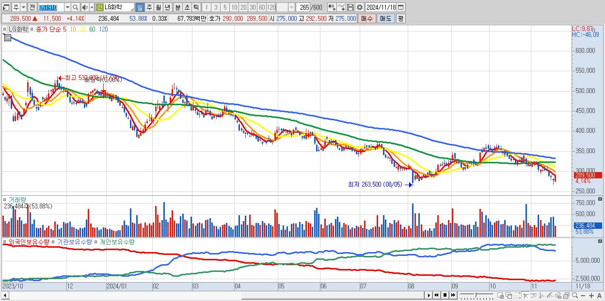 - LG화학 (289,500원 ▲ 4.14% , 시총: 204,365억, 외국인 순매수 거래금:64억)
