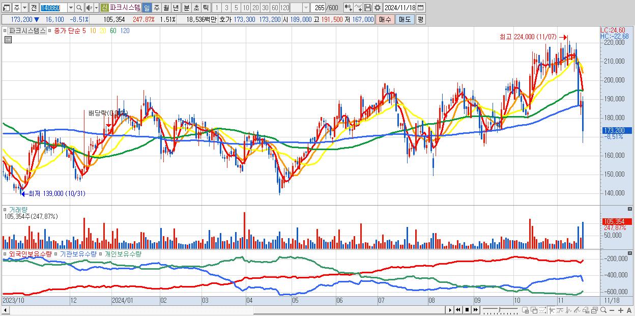 - 파크시스템스 (173,200원 ▼ -8.51% , 시총: 12,096억, 외국인 순매수 거래금:55억)
