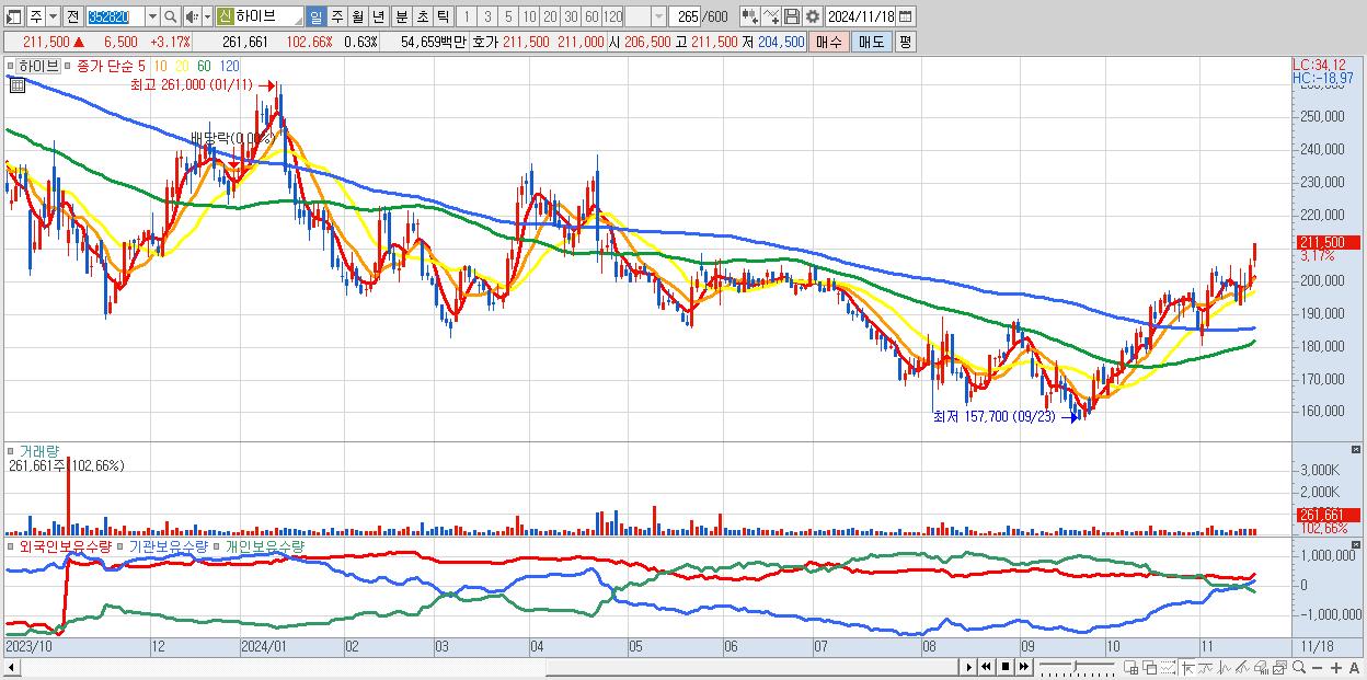 - 하이브 (211,500원 ▲ 3.17% , 시총: 88,094억, 외국인 순매수 거래금:106억)