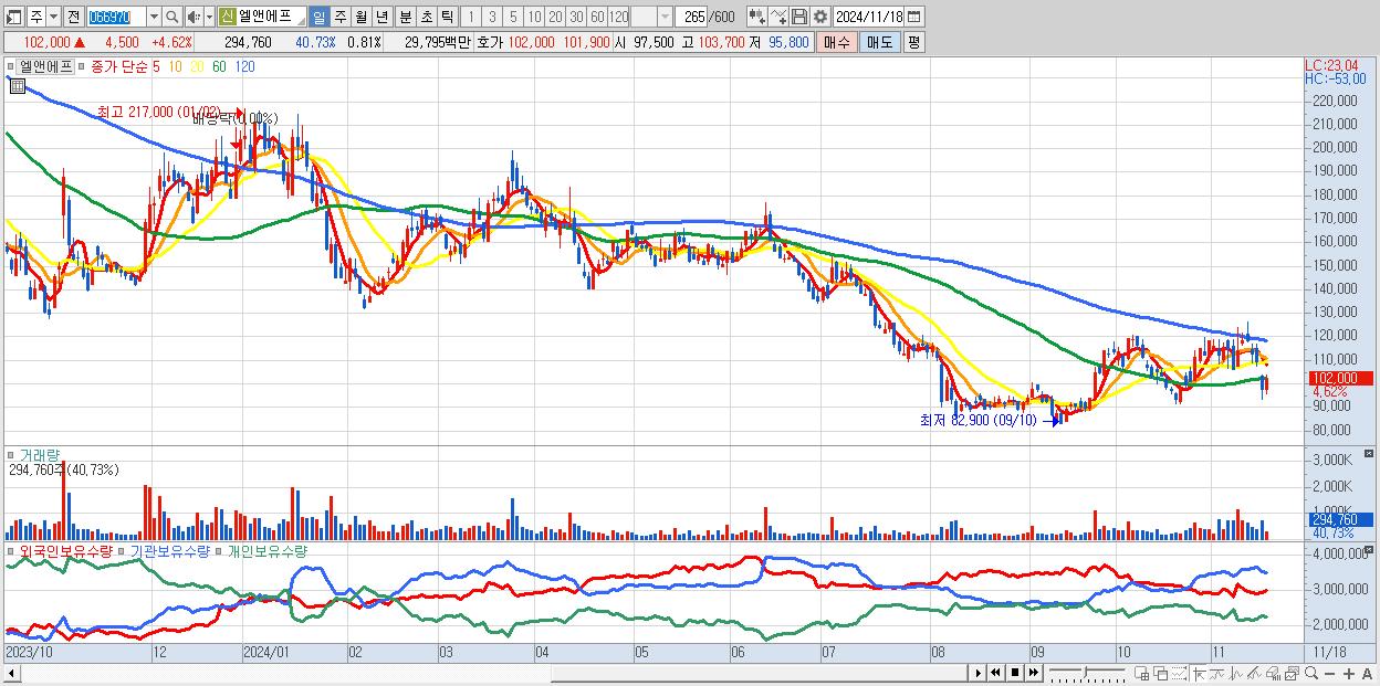 - 엘앤에프 (102,000원 ▲ 4.62% , 시총: 37,022억, 외국인 순매수 거래금:51억)