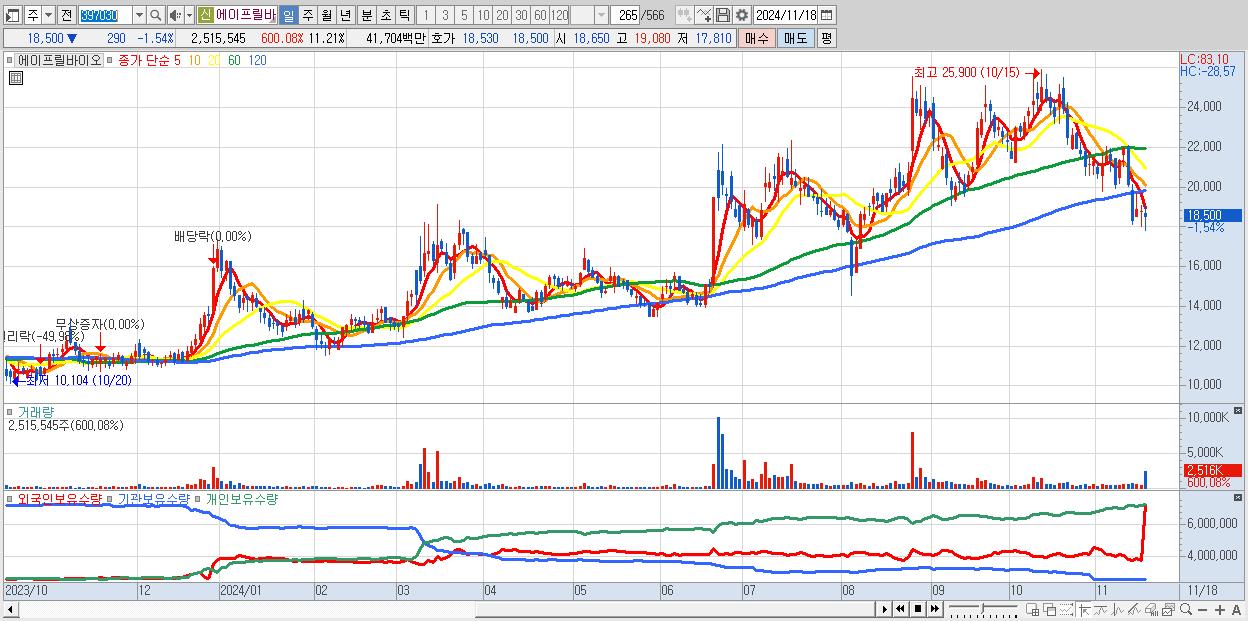 1.에이프릴바이오 18,500원 ▼ -1.54% (KOSDAQ, 397030)