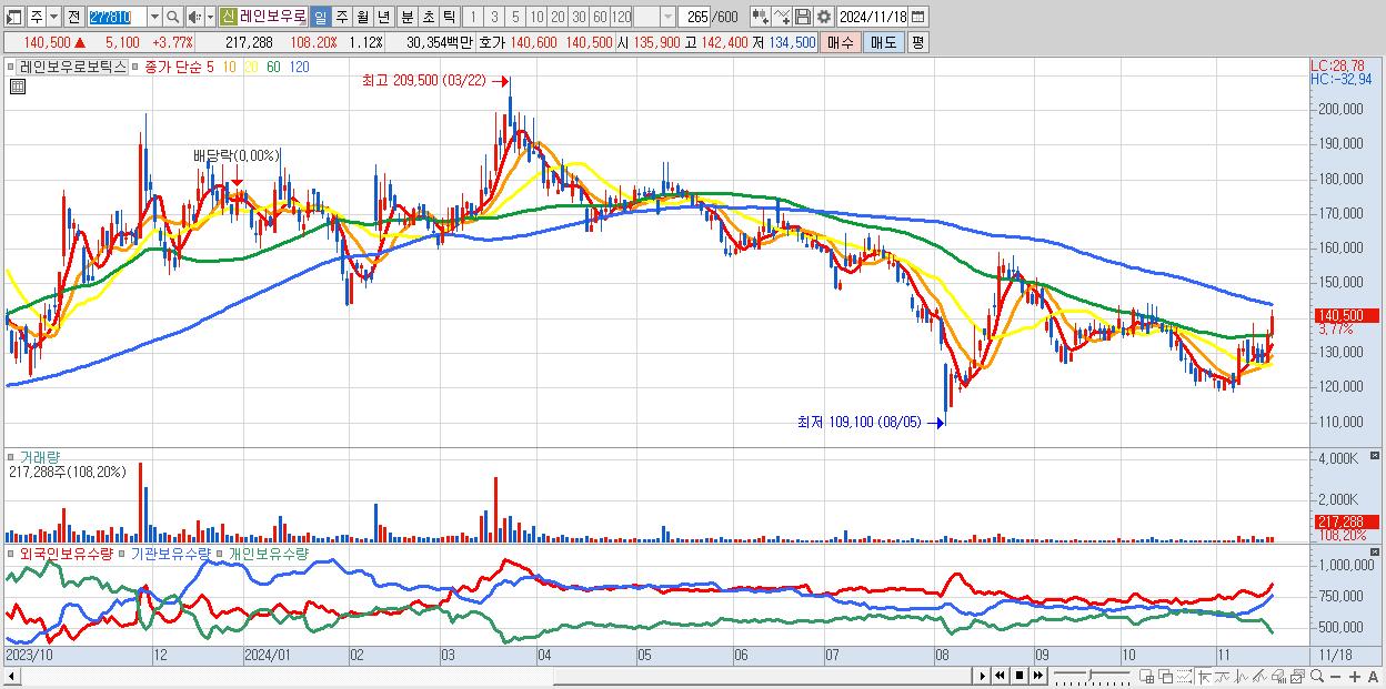 - 레인보우로보틱스 (140,500원 ▲ 3.77% , 시총: 27,257억, 외국인 순매수 거래금:45억)