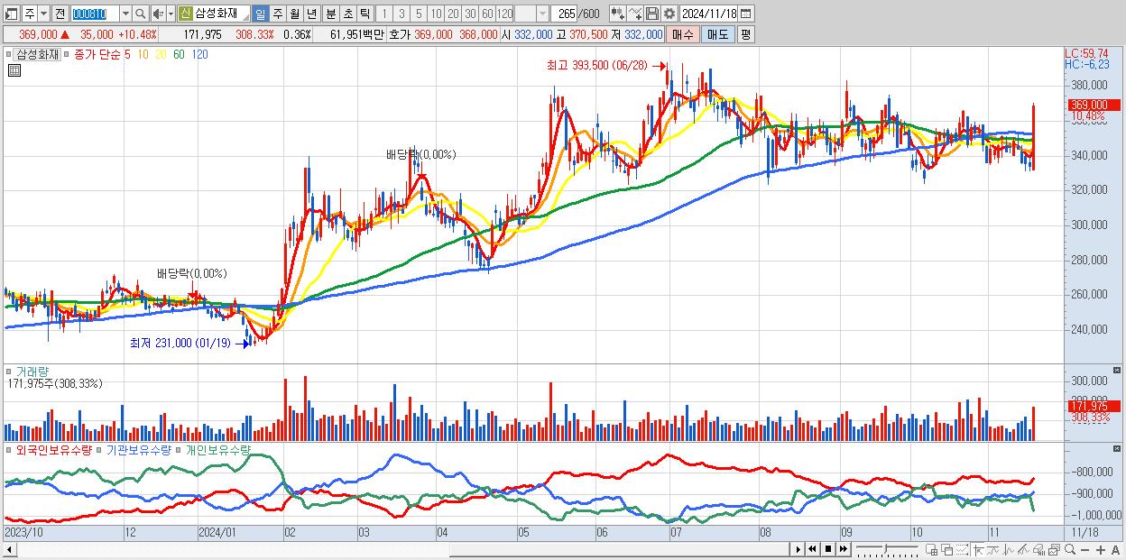 - 삼성화재 (369,000원 ▲ 10.48% , 시총: 174,813억, 외국인 순매수 거래금:148억)