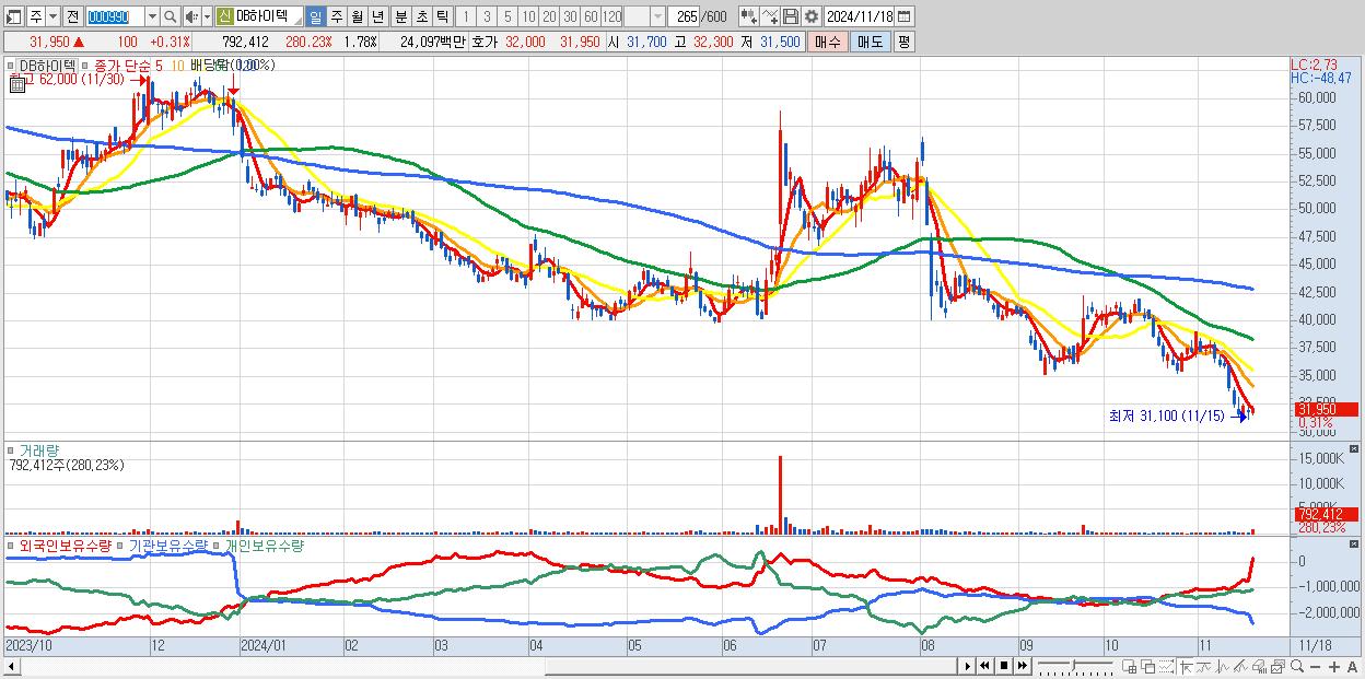 - DB하이텍 (31,950원 ▲ 0.31% , 시총: 14,185억, 외국인 순매수 거래금:193억)
