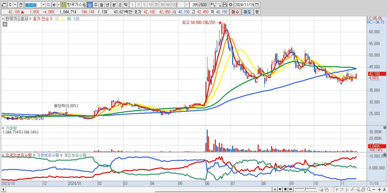 - 한국가스공사 (42,100원 ▲ 4.08% , 시총: 38,864억, 외국인 순매수 거래금:81억)