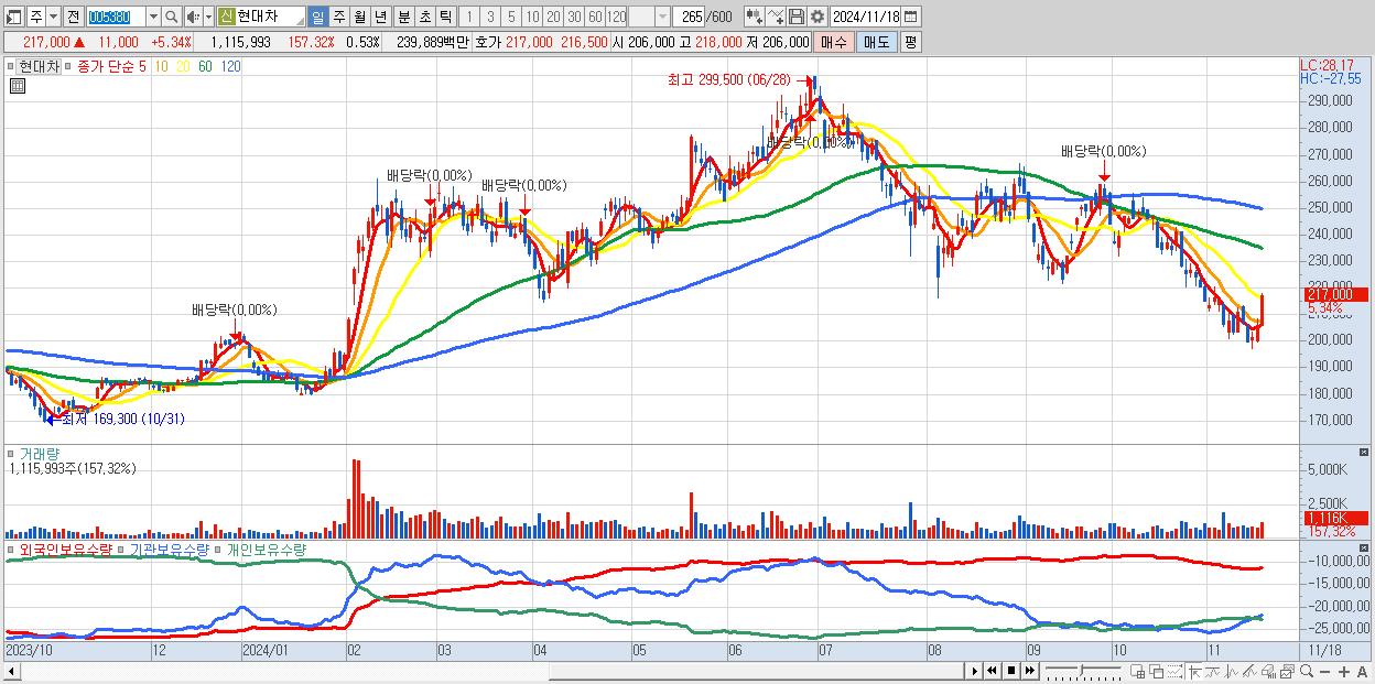 - 현대차 (217,000원 ▲ 5.34% , 시총: 454,433억, 외국인 순매수 거래금:199억)
