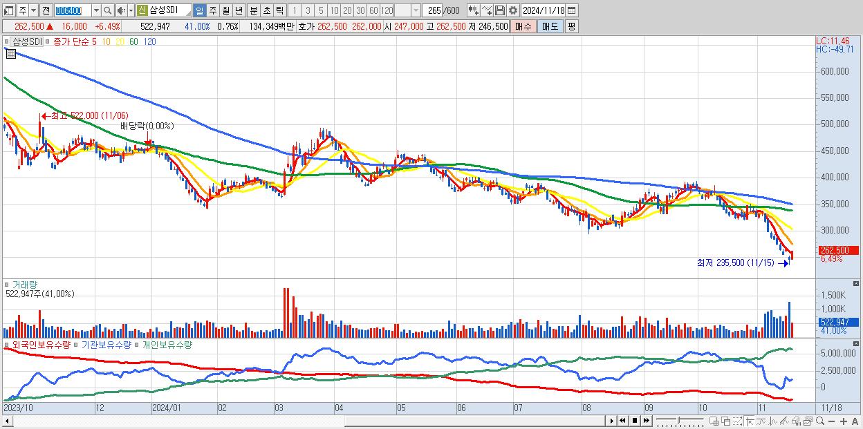 - 삼성SDI (262,500원 ▲ 6.49% , 시총: 180,507억, 외국인 순매수 거래금:168억)