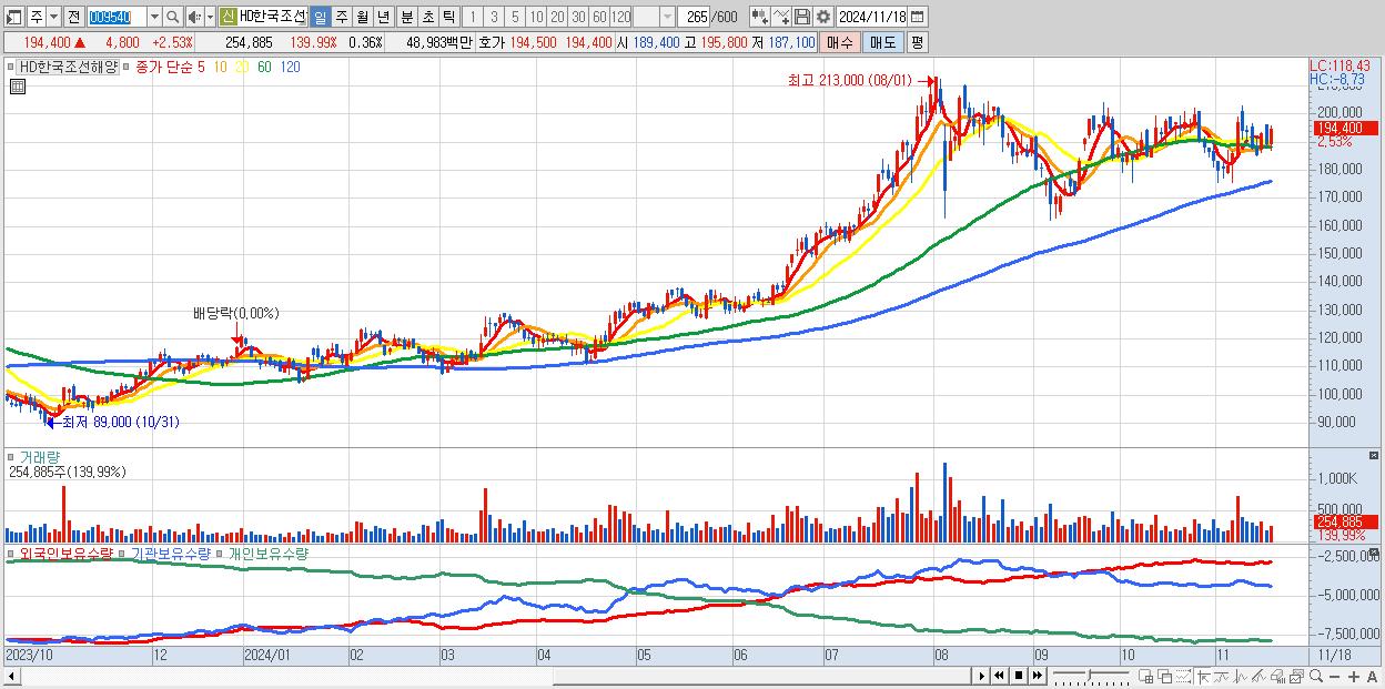 - HD한국조선해양 (194,400원 ▲ 2.53% , 시총: 137,583억, 외국인 순매수 거래금:94억)