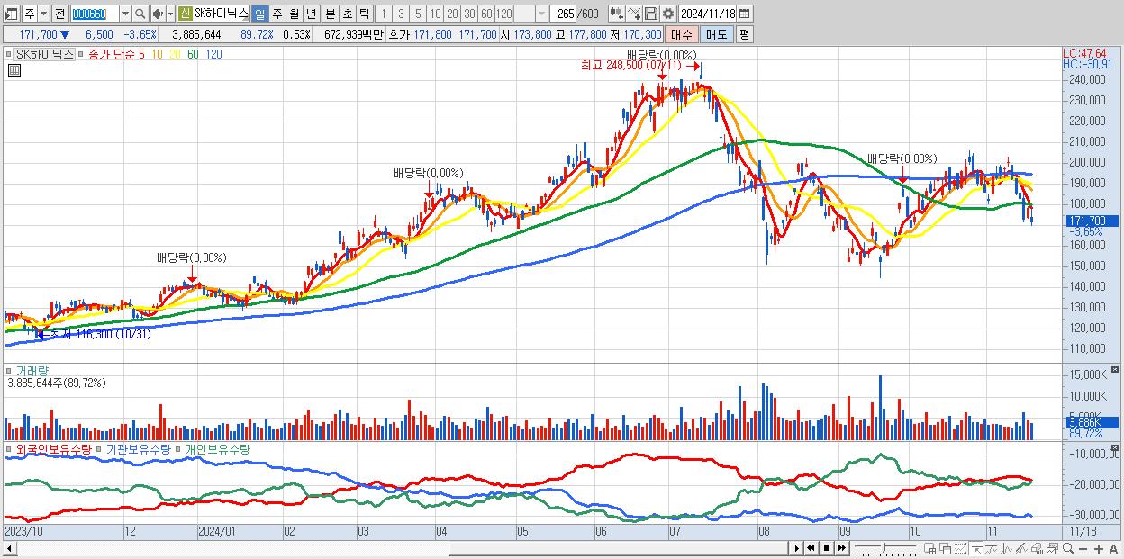 - SK하이닉스 (171,700원 ▼ -3.65% , 시총: 1,249,980억, 거래량: 3,885,644, 거래대금:6,729억)