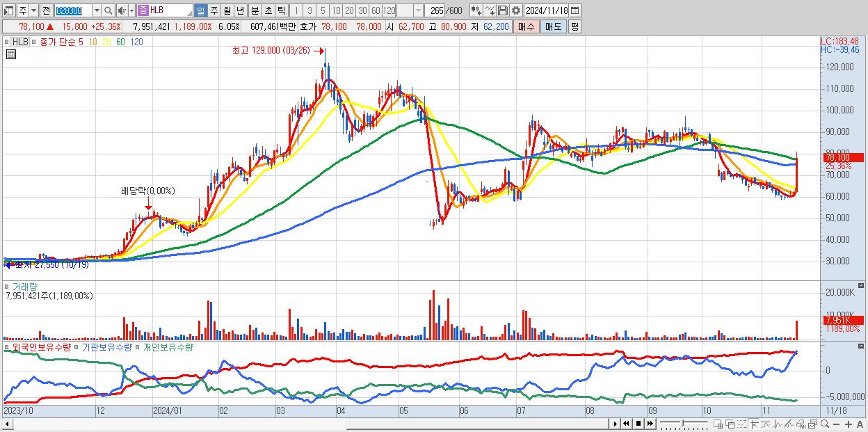 - HLB (78,100원 ▲ 25.36% , 시총: 102,614억, 거래량: 7,951,421, 거래대금:6,075억)