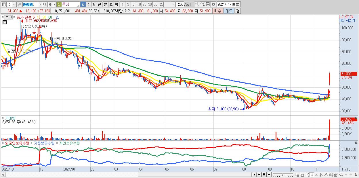 - 루닛 (61,300원 ▲ 27.18% , 시총: 17,742억, 거래량: 8,851,681, 거래대금:5,183억)