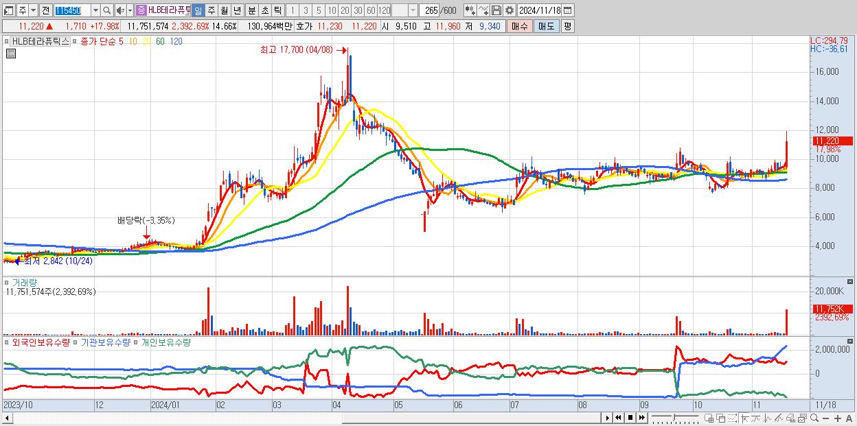 - HLB테라퓨틱스 (11,220원 ▲ 17.98% , 시총: 8,992억, 거래량: 11,751,574, 거래대금:1,310억)