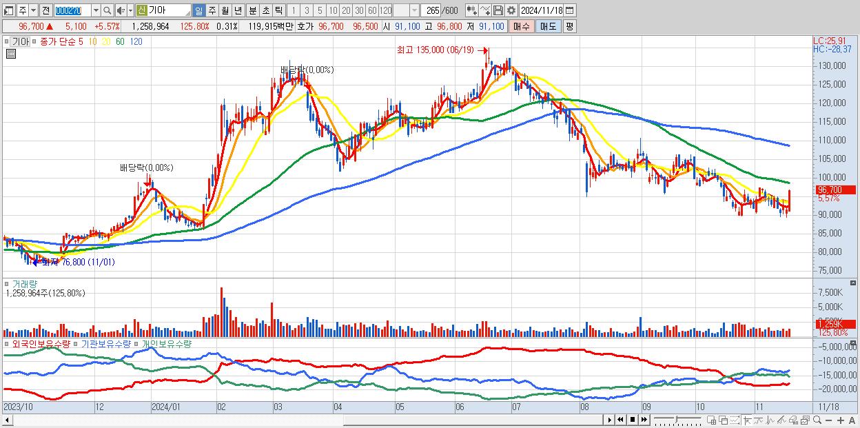 - 기아 (96,700원 ▲ 5.57% , 시총: 386,663억, 거래량: 1,258,964, 거래대금:1,199억)