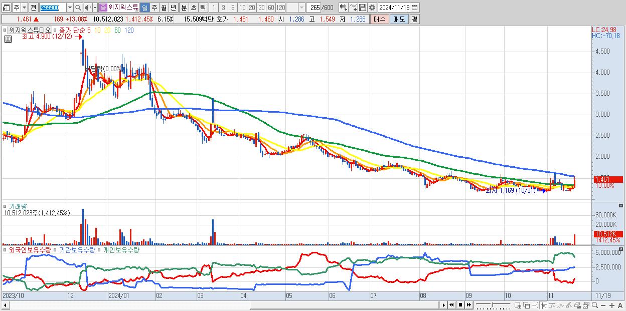 - 위지윅스튜디오 (1,461원 ▲ 13.08% , 시총: 2,499억, 거래량: 10,512,023, 거래대금:155억)