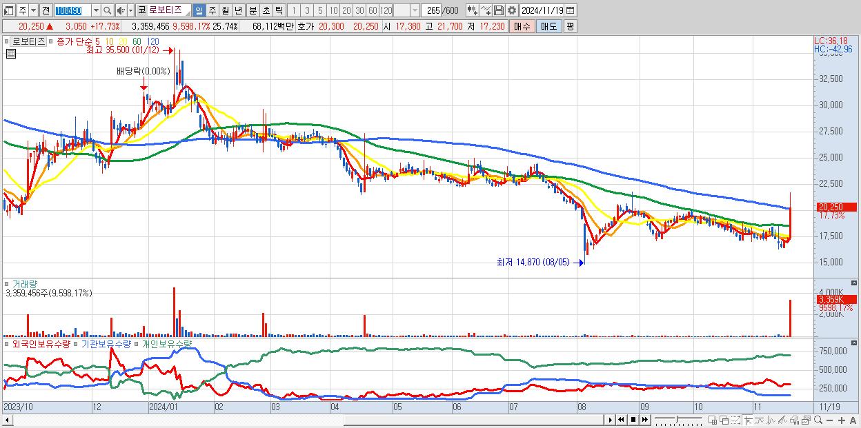 - 로보티즈 (20,250원 ▲ 17.73% , 시총: 2,643억, 거래량: 3,359,456, 거래대금:681억)