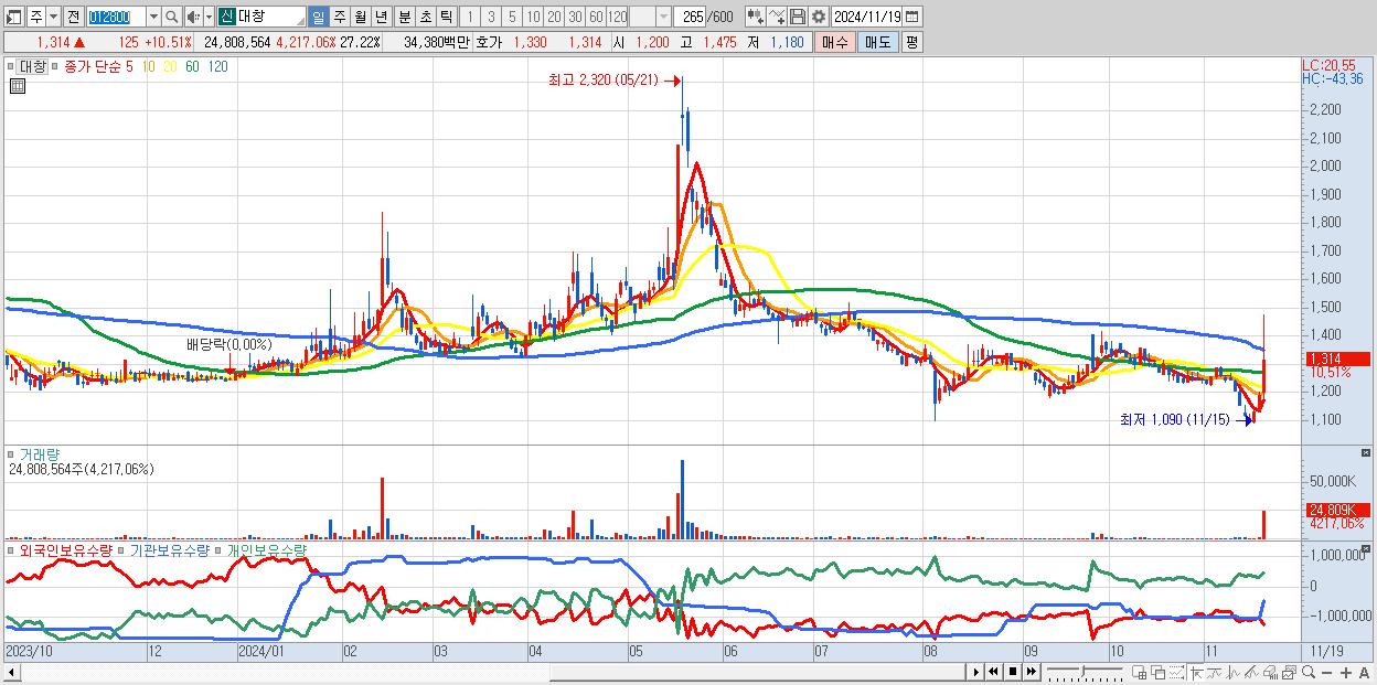 - 대창 (1,314원 ▲ 10.51% , 시총: 1,198억, 거래량: 24,808,564, 거래대금:344억)