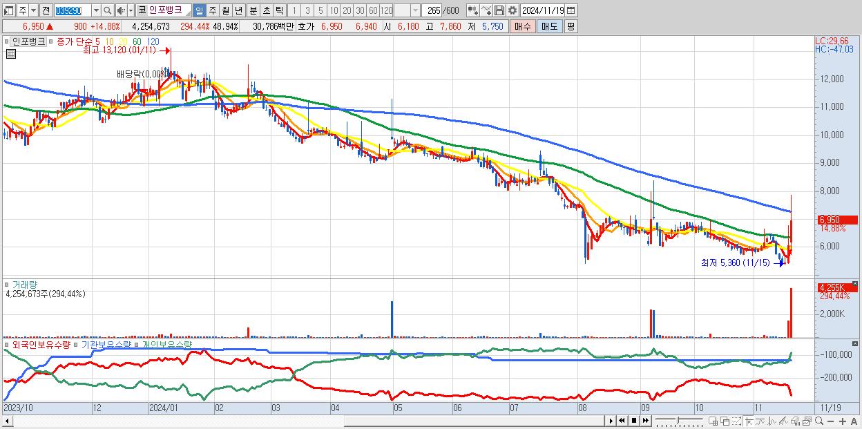 - 인포뱅크 (6,950원 ▲ 14.88% , 시총: 604억, 거래량: 4,254,673, 거래대금:308억)