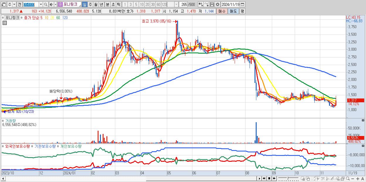 - 포니링크 (1,317원 ▲ 14.12% , 시총: 1,683억, 거래량: 6,556,548, 거래대금:88억)