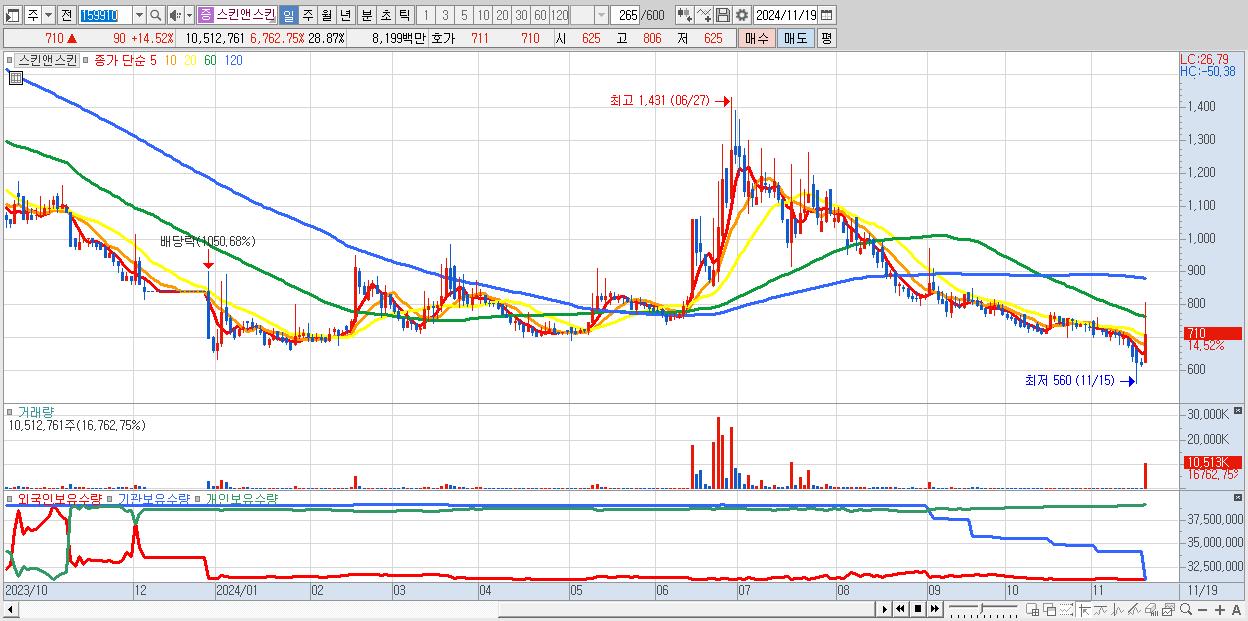 - 스킨앤스킨 (710원 ▲ 14.52% , 시총: 259억, 거래량: 10,512,761, 거래대금:82억)