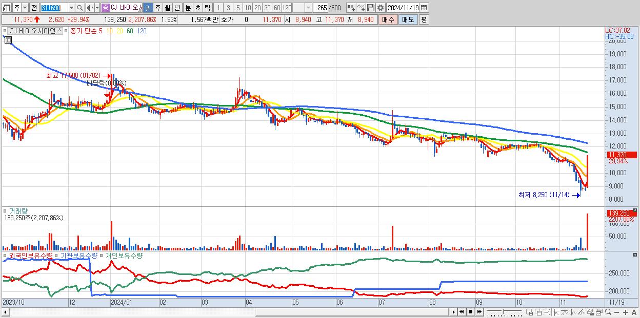- CJ 바이오사이언스 (11,370원 ▲ 29.94% , 시총: 1,036억, 거래량: 139,250, 거래대금:16억)