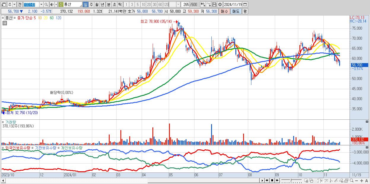- 풍산 (56,700원 ▼ -3.57% , 시총: 15,890억, 외국인 순매수 거래금:44억)
