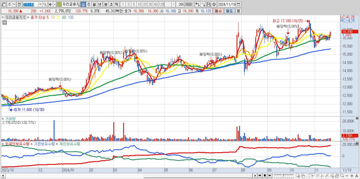 - 우리금융지주 (16,390원 ▲ 1.24% , 시총: 121,711억, 외국인 순매수 거래금:142억)