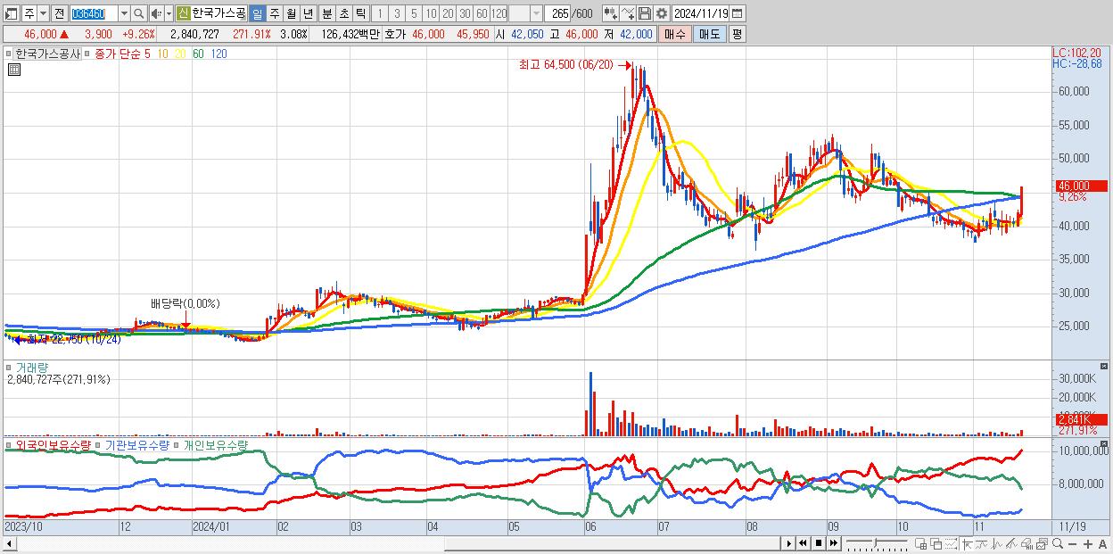 - 한국가스공사 (46,000원 ▲ 9.26% , 시총: 42,464억, 외국인 순매수 거래금:117억)