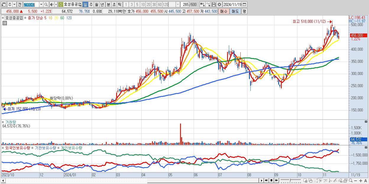 - 효성중공업 (456,000원 ▲ 1.22% , 시총: 42,520억, 외국인 순매수 거래금:114억)